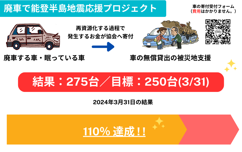 「廃車で被災地支援プロジェクト」目標達成!能登半島地震での支援のために全国から275台の車の寄付が集まりました。