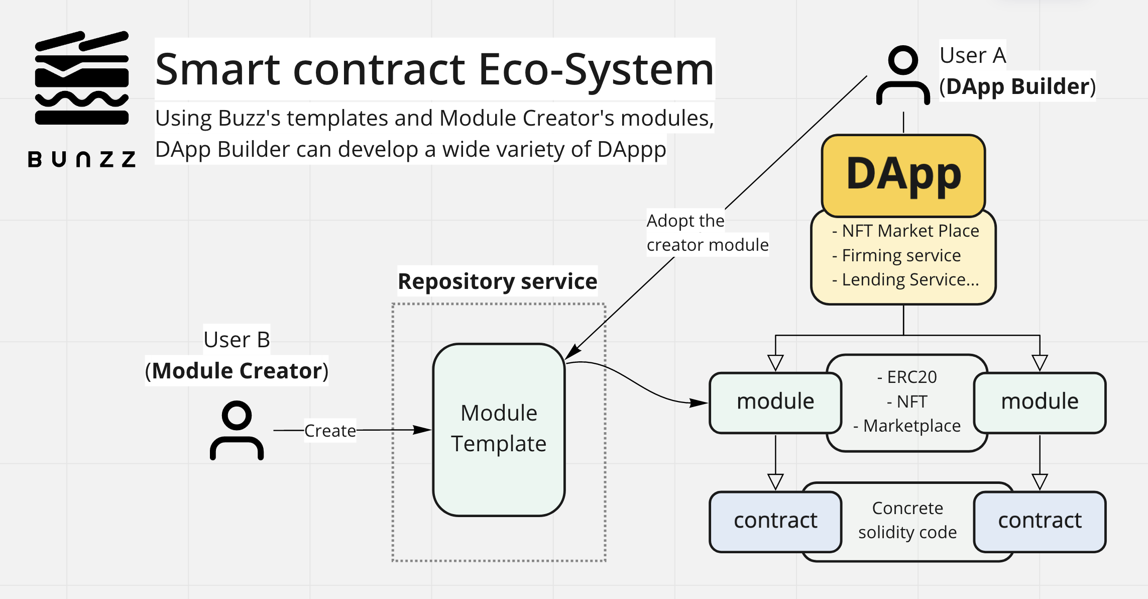Bunzzは開発ツールとしての提供価値をファーストステップとして、最終的にはスマートコントラクトのエコシステム、分かりやすく言えば『Web3版のDocker Hub』を目指すプロジェクトです。Bunzzの特徴はモジュール化されたスマートコントラクトをレゴブロックのように組み合わせられることにありますが、8月上旬にローンチを控えた新機能「レポジトリサービス」では、Bunzzユーザー自身がモジュールを開発・公開でき、Docker Hubのように様々なテンプレートが利用可能になります。