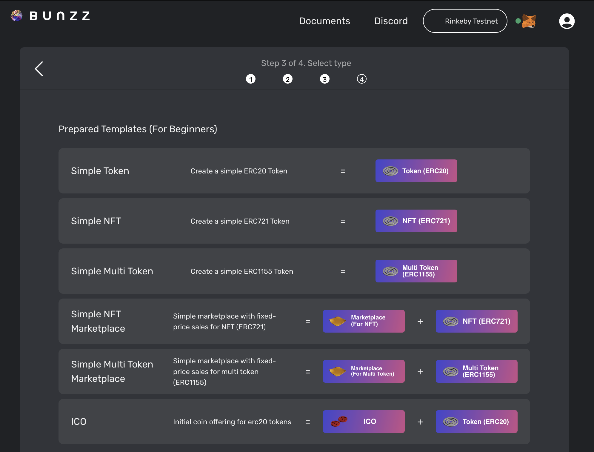 Bunzzではこれらの開発を抽象化し、必要なSolidityコードをGUI(グラフィックユーザーインターフェース)で選択し、デプロイまで可能な機能を提供しています。