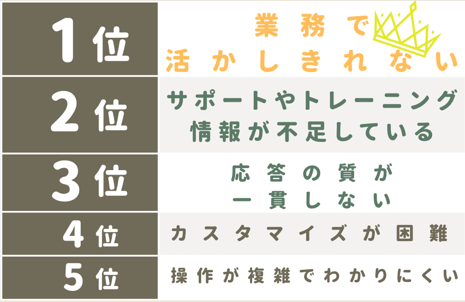 最も顕著な課題は「業務での活用が難しい」という点で、具体的にはサポートやトレーニングの不足、応答の質の一貫性の欠如、カスタマイズの困難さ、操作の複雑さなどが挙げられています。