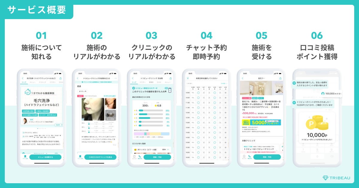 当社では、美容クリニックや施術に関する体験者のリアルな口コミやクリニック・ドクターごとの強みや専門性といった検討者が必要とする情報を伝えることを目的に、2017年10月より、美容医療口コミ・予約アプリ『トリビュー』を開発・提供しています。美容医療によって悩みを解決する施術方法には複数の選択肢があり、その侵襲度やダウンタイム期間、価格も異なることから、ユーザーの悩みに合わせた解決方法の解説や相場価格、実際に施術を受けたユーザーの満足度などリアルな情報がわかるという点が『トリビュー』の機能特長となっています。