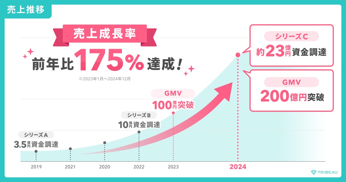 コロナ禍でのライフスタイルの変化による需要拡大を追い風に、独自データおよび口コミの蓄積に加えて、導入クリニックや施術メニュー数の拡大、UI/UX改善を重ねることで、2024年10月には累計150万ダウンロードを突破し、累計GMVは200億円に到達。売上成長率は前年比175%ペースで推移し、日本を代表する業界最大規模の美容医療プラットフォームへと成長しています。