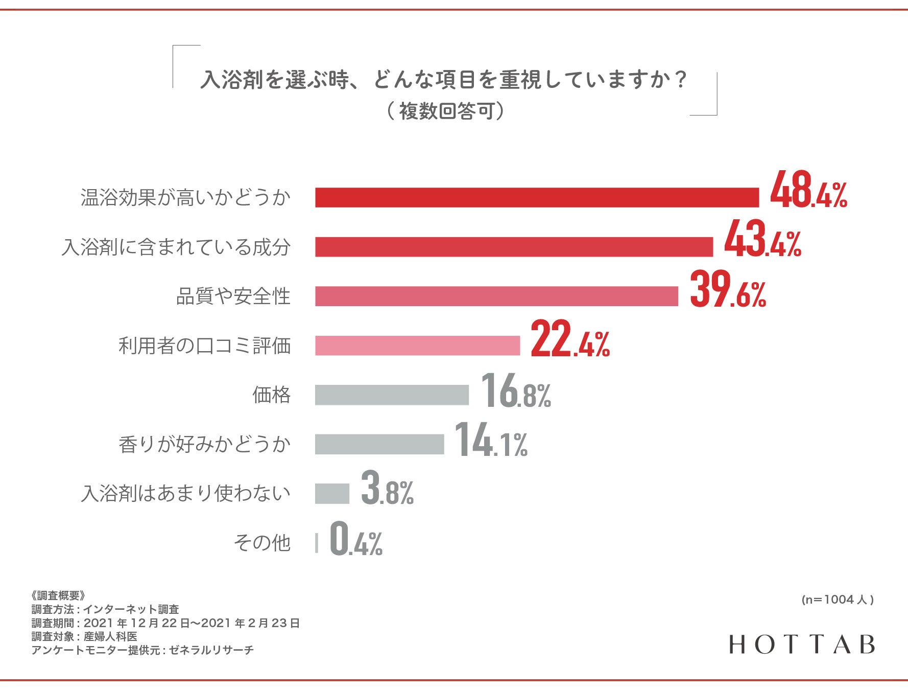 - 産婦人科医の約半数が「温浴効果」と「成分」を重視