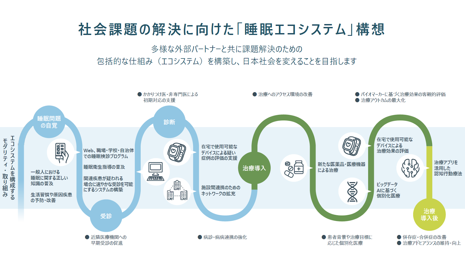 Ubieは、生活者がスマートフォンやPCから質問に回答することで、症状に関連する病名と相談可能な近隣の医療機関を調べられるサービスである症状検索エンジン「ユビー」等を提供しています。また、アキュリスファーマは、複数の睡眠関連疾患における新薬の開発・商業化に向けた活動を日本国内で行うとともに、睡眠に関わる社会課題を解決するための「睡眠エコシステム」構想を掲げ、その実現に向けた取り組みを展開しています。
