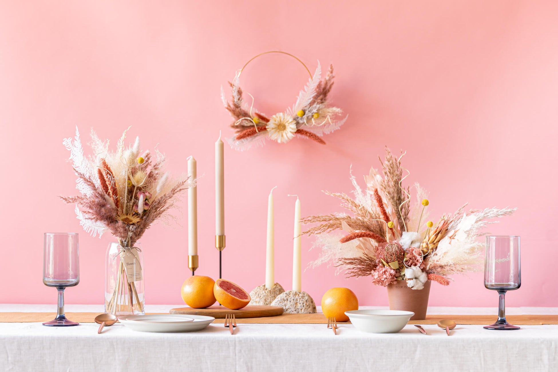 コーラルピンクのドライフラワーをメインに、クラスペディアのイエローを差し色に入れて、明るく軽やかなデザインでご用意しました。ビビットな色味のセタリアと、ふんわり柔らかいテールリードとの対比がポイントです。アクセントとしてコンパクタやバンクシアなど、個性的なネイティブフラワーもあしらいました。