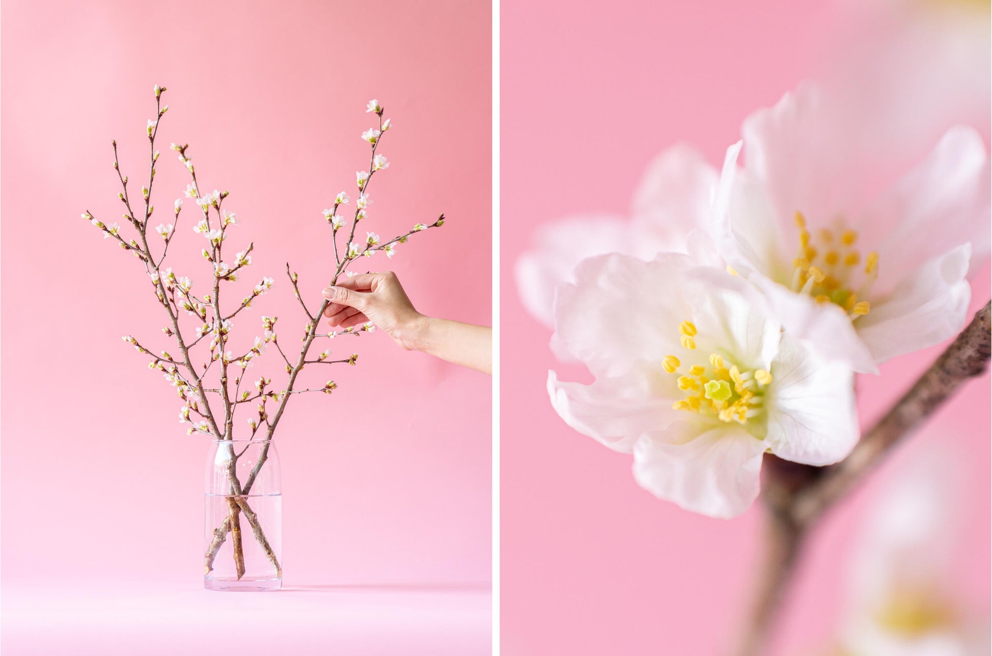 「桜の枝のブーケ」は、初めは蕾の状態でお届けします。ご自宅で成長〜見頃を楽しめるのがポイントです。リビングなどの暖かいところに置いておくと徐々に蕾が膨らみ、時間をかけて淡いピンクの花が咲いていきます。花瓶とセットで飾れるサイズ感で、満開まで長くお楽しみいただけます。
