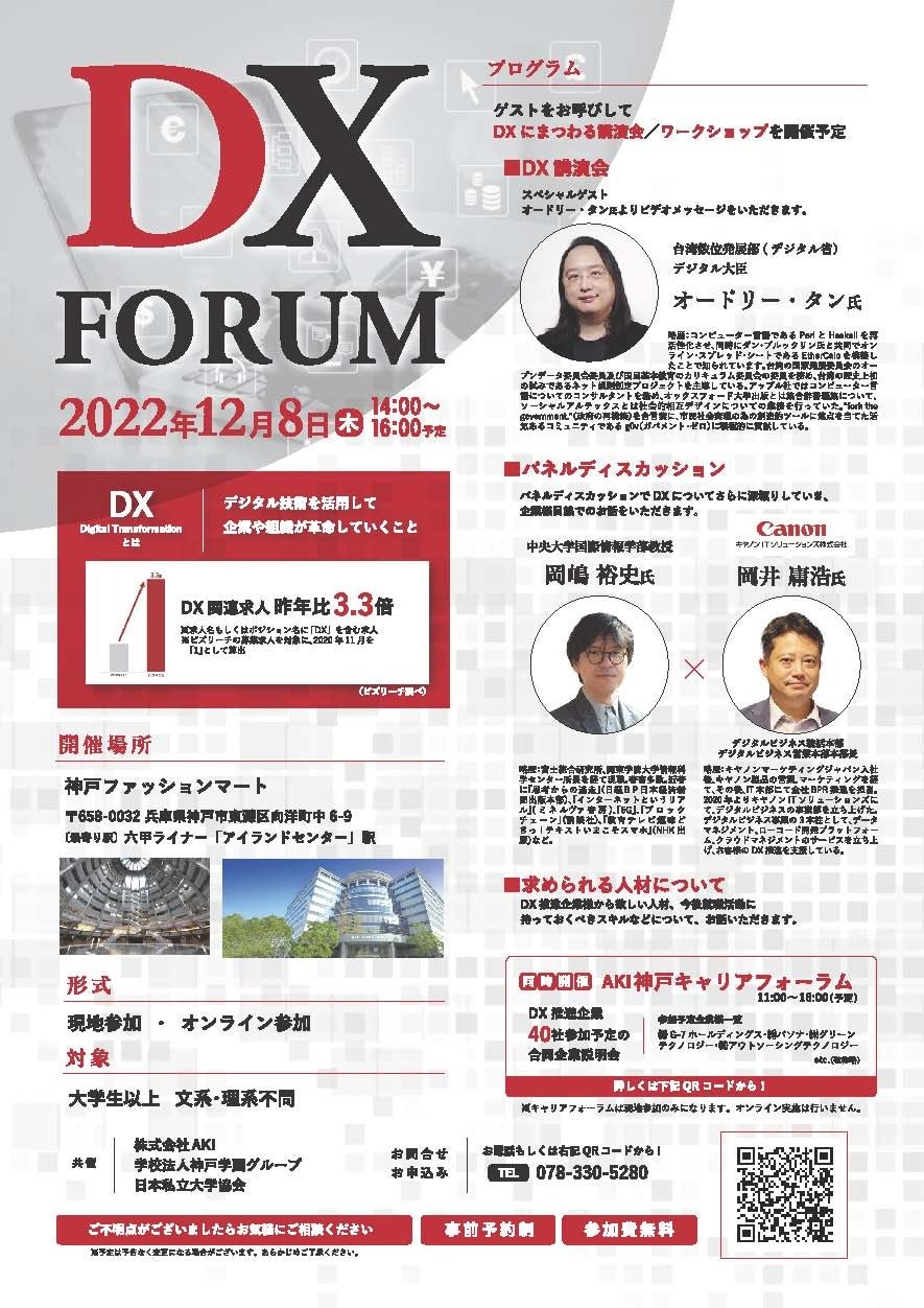 12/8(木)AKI神戸キャリアフォーラム&DXフォーラム同時開催!【スペシャルビデオ出演 台湾デジタル大臣「オードリー・タン氏」】