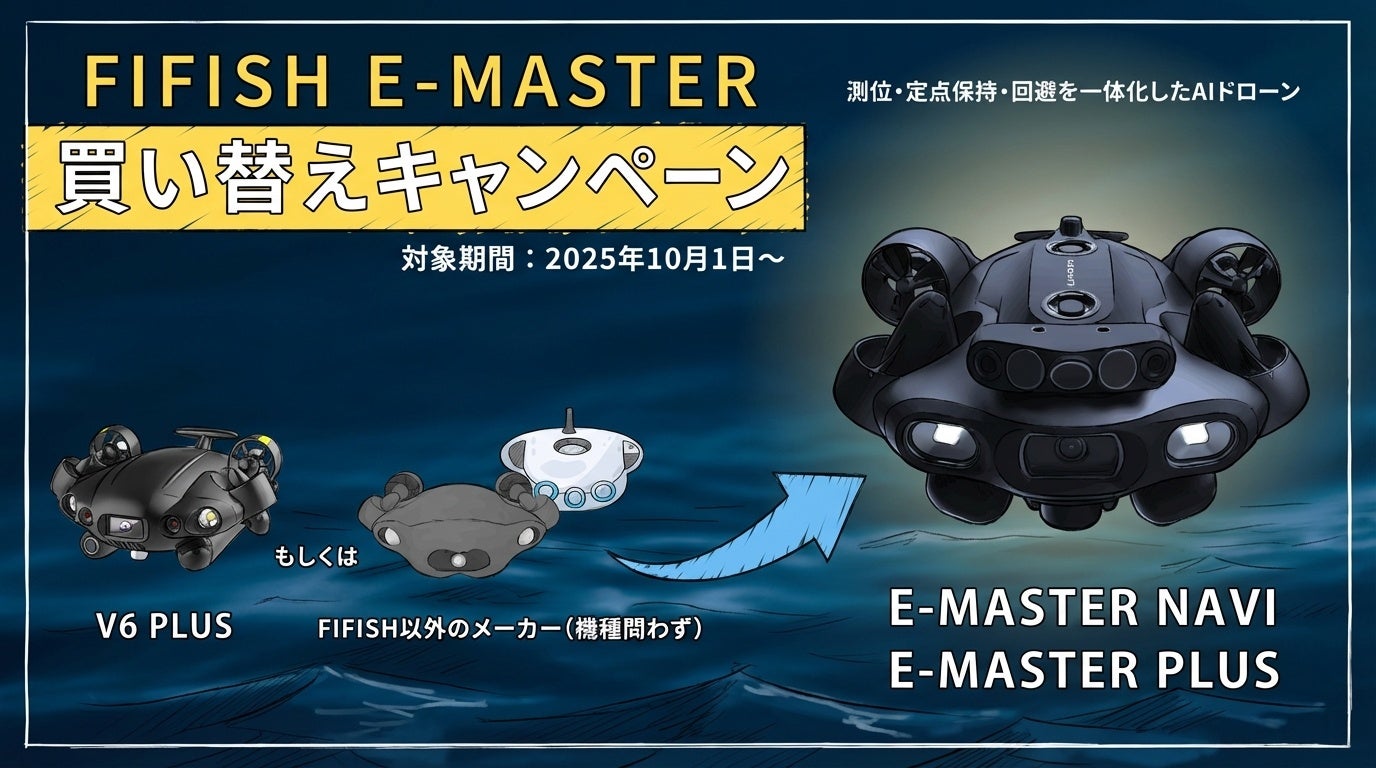 現在、FIFISH V6 PLUSまたは他メーカー製水中ドローンをご使用中のエンドユーザー様を対象に、E-MASTERシリーズへの買替支援制度を実施いたします。