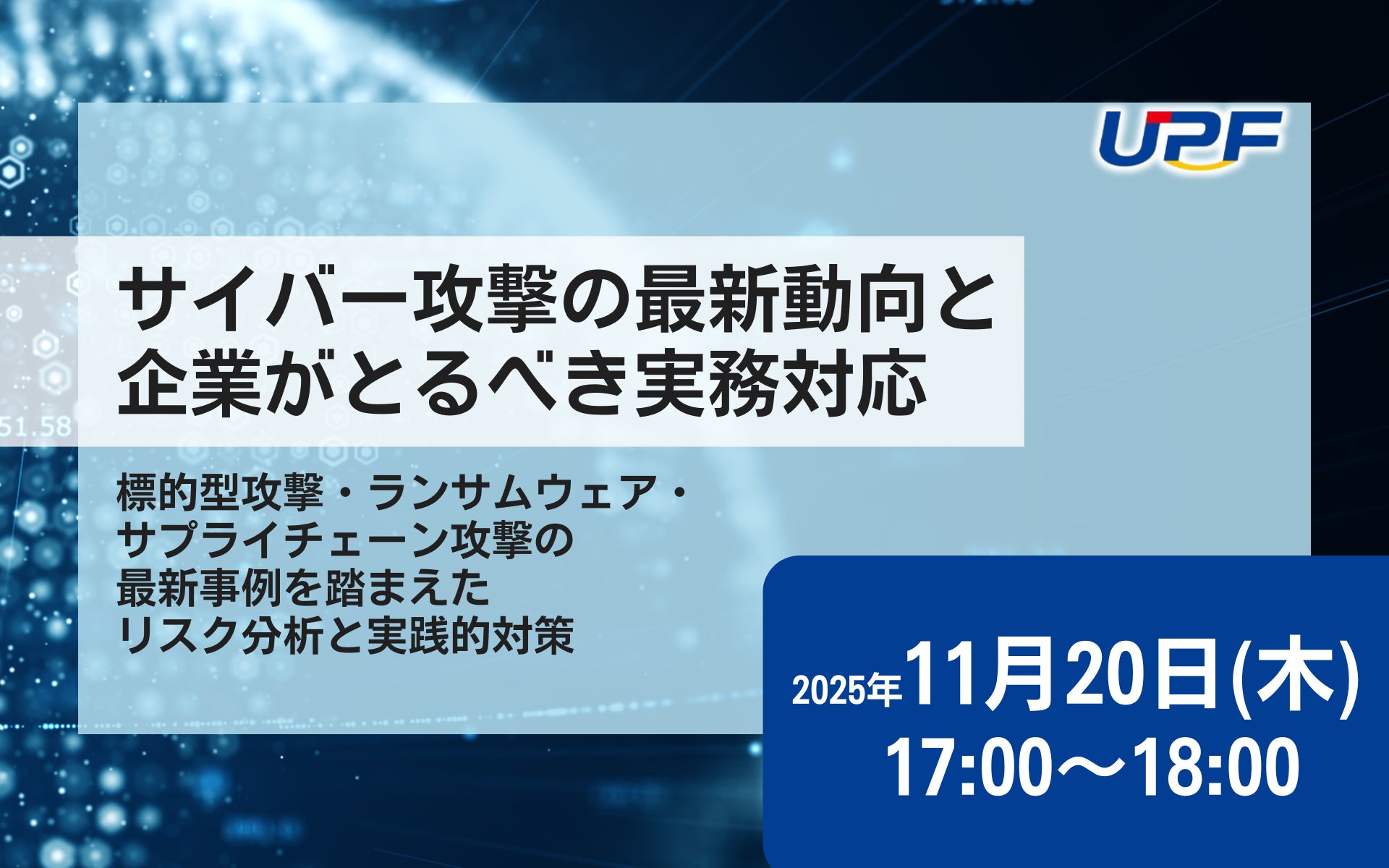 リスクマネジメント分野のコンサルティングサービスを提供する株式会社UPF(本社:東京都中央区、代表取締役:仲手川 啓、以下当社)は、2025年11月20日(木)17:00より、サイバー攻撃の最新動向と企業がとるべき実務対応をテーマとしたオンラインセミナーを開催いたします。