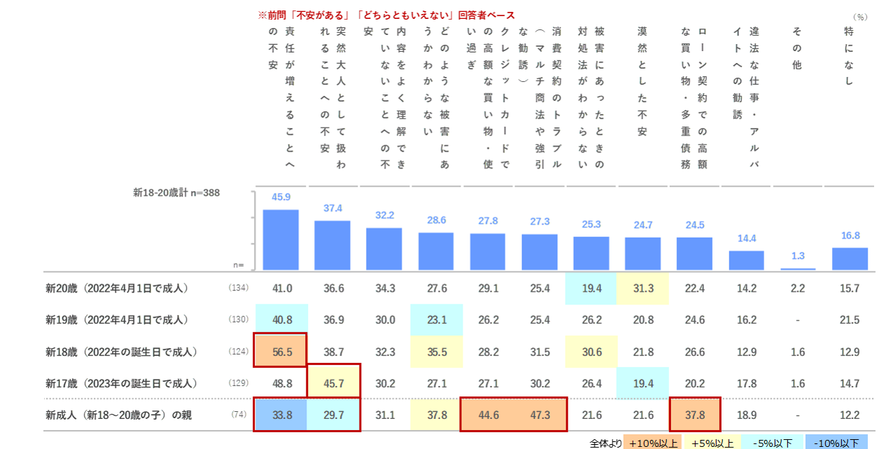 - 新18~20歳は「責任が増えることへの不安」45.9%や、「突然大人として扱われることの不安」37.4 %と精神面での不安が上位。一方で、「新成人の親」は「消費契約のトラブル」47.3% 、「クレジットカードでの高額な買い物」44.6%など消費トラブルへの不安を挙げる。