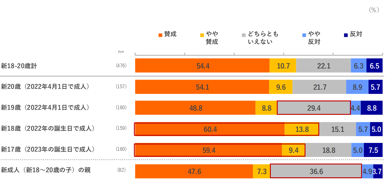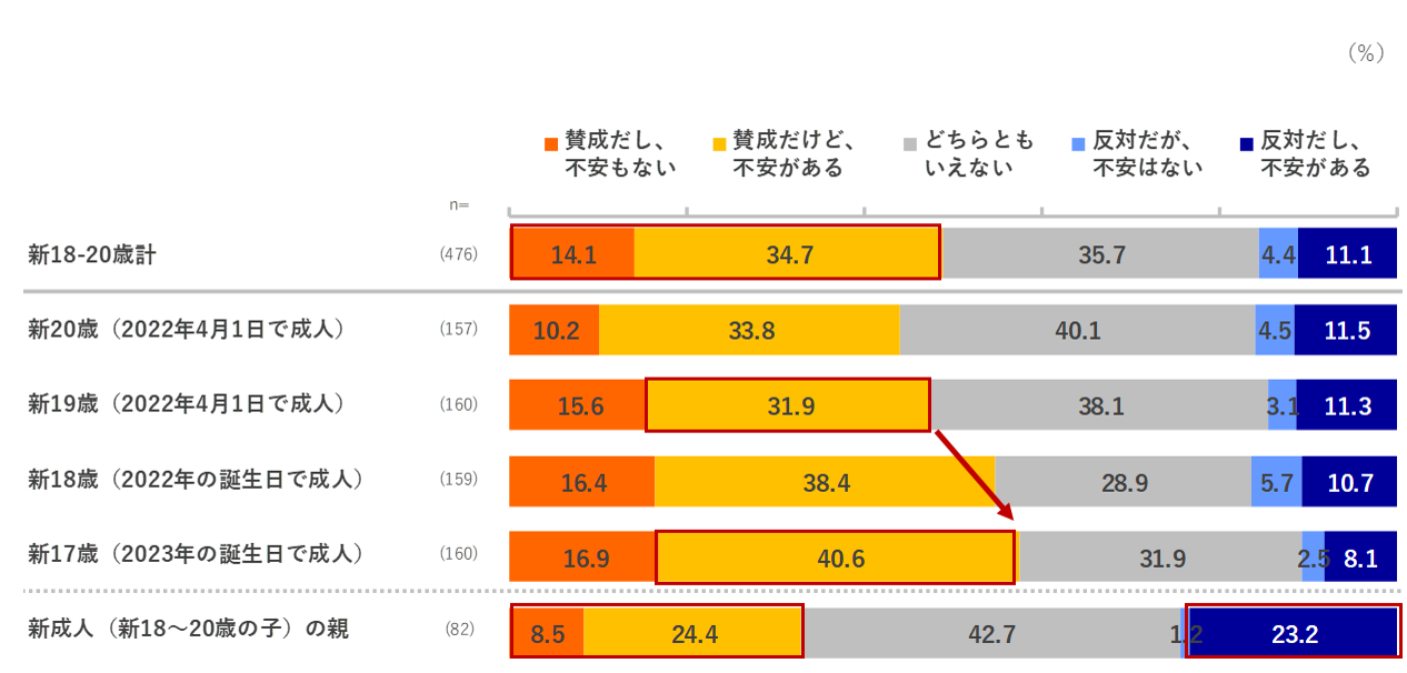 - 新18~20歳は48.8%が賛成だが、うち「賛成だが不安がある」が34.7%と不安を感じる新成人が3割を超える。新成人の親の賛成は32.9%と新18~20歳より▲15.9ptsであり、 「反対だし、不安がある」が23.2%と最も高く、親世代の不安が読み取れる。