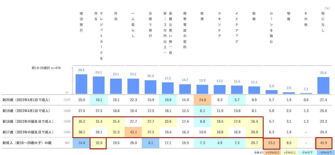 - 新18~20歳は上位に「宿泊旅行」29.4%、「クレジットカードを作る」26.1%、「外泊」「一人暮らし」23.1%と、外向きの行動を中心に自由にしたいと考えている。一方で「新成人の親」は、「クレジットカードを作る」32.9%、「ローンを組む」23.2%など金銭面の許可の必要性を挙げるが、「特になし」も43.9%挙がる。