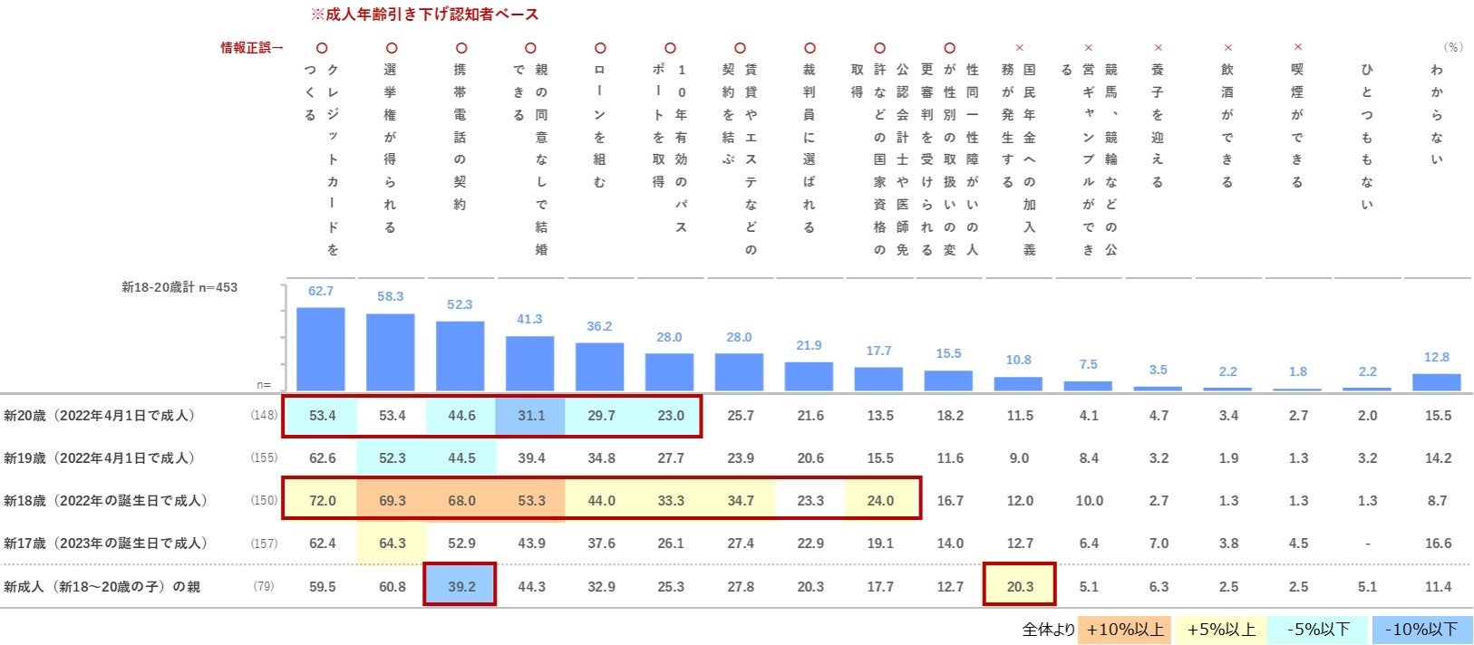 - 新18~20歳における「クレジットカードを作る」「選挙権が得られる」「携帯電話の契約」の認知は5割を超える。正情報が上位、誤情報は下位となっているが、最も認知の高い「クレジットカードをつくる」が6割と、成人年齢引き下げ認知9割と比較すると実施内容の理解度は低い。