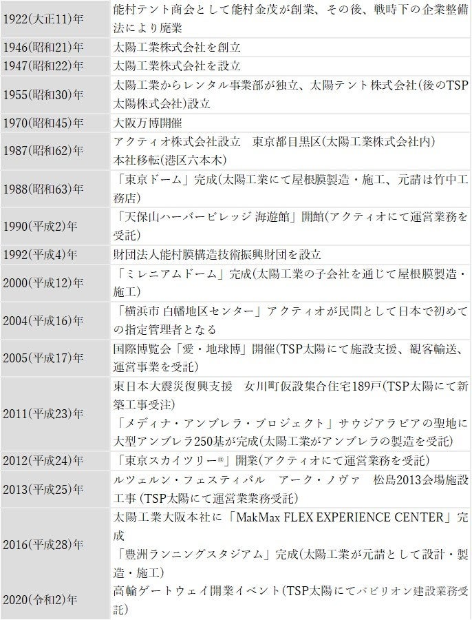 太陽グループは1922年、能村テント商会として創業し、その後、戦後の焼け野原の中、ミシン一台ハサミ一丁から再スタートを切りました。創業以来、「少しでも社会の役に立ちたい、一人でも多くの人に感動を届けたい」という思いのもと、「膜」素材の特徴を活かしたユニークな製品を世に送り出してきました。「膜」技術をベースに1970年の大阪万博で大規模なパビリオン設営や運営を請け負うなかで、TSP太陽やアクティオが誕生し、能村テント商会を起源とする今日のグループ3社が形成され、総売上740億円規模のグループへと成長を遂げました。