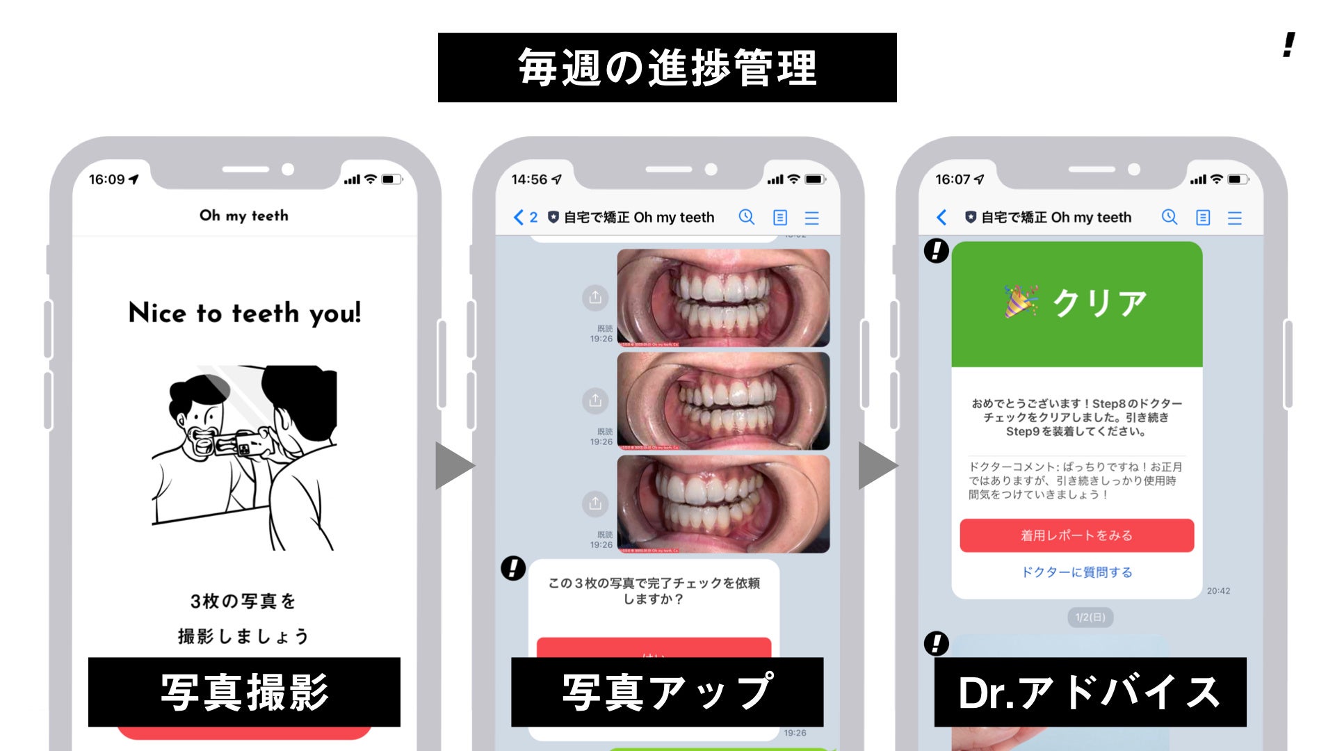毎週のマウスピース交換時には、装着写真を送信するとドクターからアドバイスが届きます。