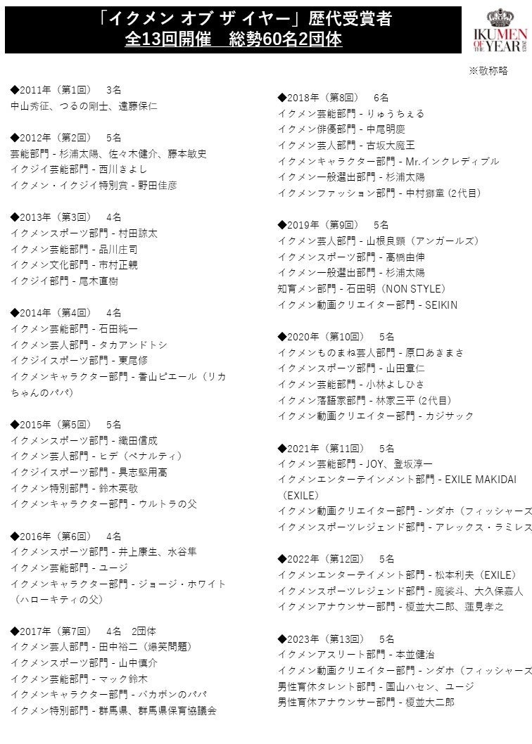 老若男女多くの生活者におなじみの著名人が表彰されながら「イクメン」としての自覚や生活の充実を発信していくことで、「イクメン」という言葉の定着はもとより、国内男性の育児参加や、本プロジェクト開催前の2010年には1.5%程度であった男性育休取得率が今年30%を超え、男性育休の啓蒙に関する社会的気運を高めることに寄与することができたと考えており、前回発表を区切りとして、「イクメン オブ ザ イヤー」の開催を終了いたします。
