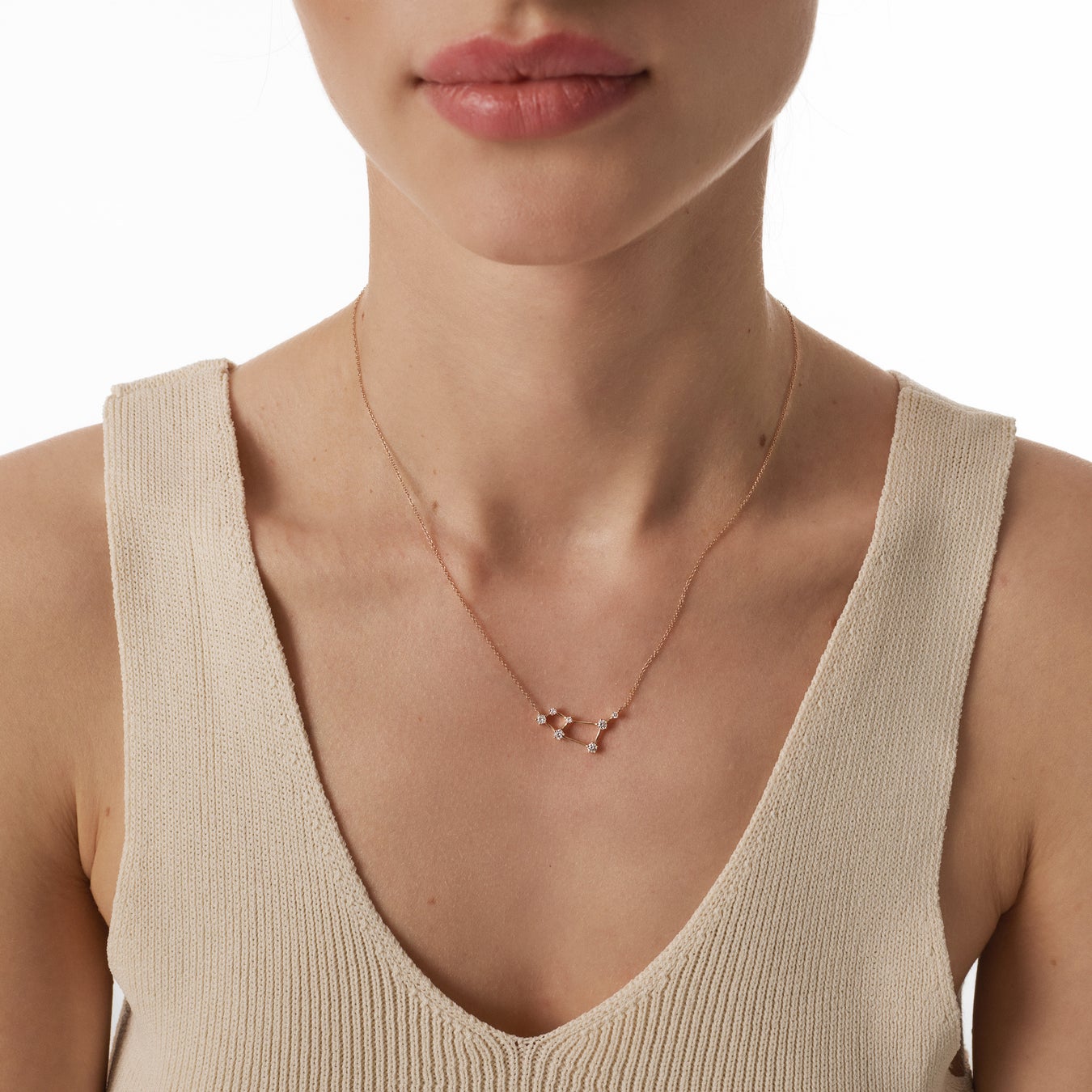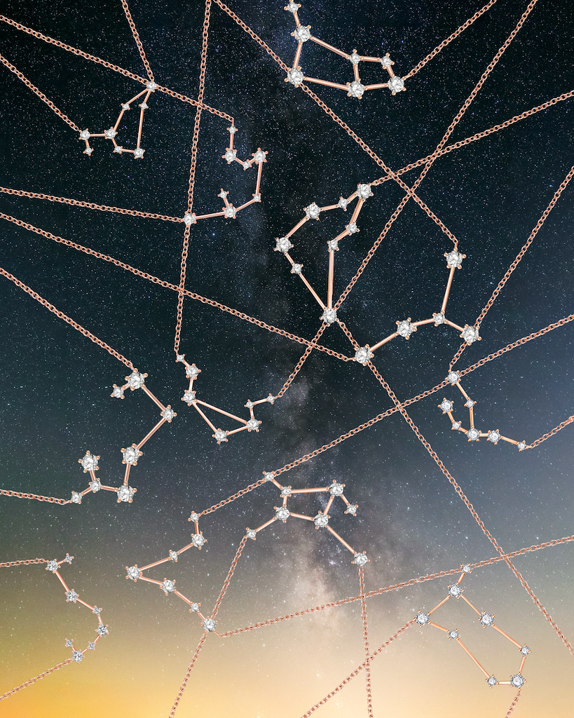 「Design Lab」によって精巧に作られたネックレスは、それぞれ12星座の形を型取り、特徴的な星の形を表すさまざまなサイズのラボグロウンダイヤモンドでできています。18Kローズゴールド、イエローゴールド、ホワイトゴールドで展開され、デコルテの上で繊細に輝くエレガントなアイテムは、星の持つ神秘的なパワーを表現します。
