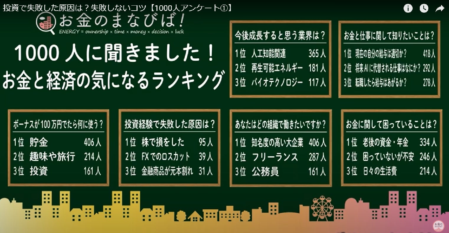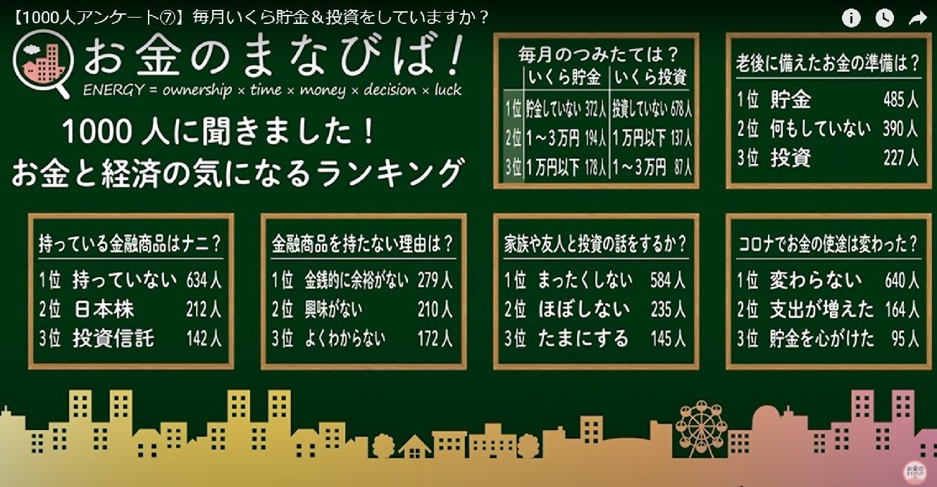 また、「1,000人アンケート」シリーズでは、1,000人にお金と経済について実施したアンケートの結果を藤野が分かりやすく解説し、身近な疑問を解消します。シリーズ①「投資で失敗した原因は?失敗しないコツ」(https://www.youtube.com/watch?v=9giBHZU0l0g)では、そもそも投資とは何なのか、また投資で失敗しないコツとは、というテーマを取り上げ、56万再生を超えました。