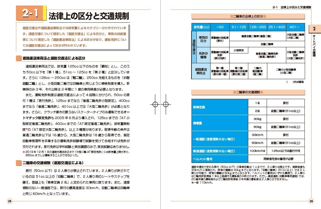 バイクユーザーが知りたい情報が満載。必要な知識が網羅されています。法制度の変更による、法律区分や免許制度や交通規制など、法律変更の最新の情報にも対応しています。