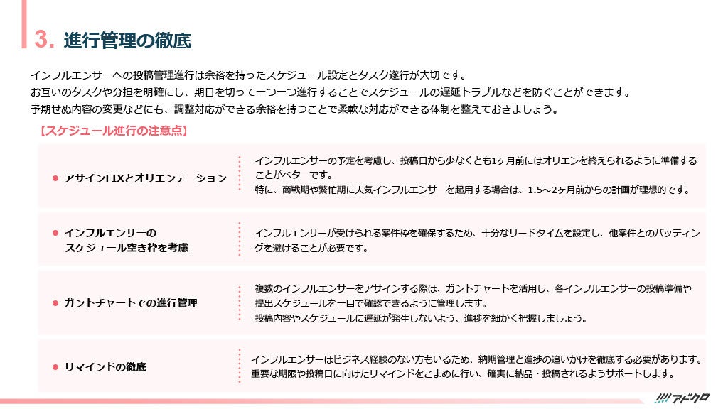 本資料では、効果的なインフルエンサーの活用方法から、実践的にオペレーション時に注意したいことなど、インフルエンサーマーケティングを検討されている事業者様〜進行管理方法で課題を抱えている事業者様まで幅広く役立つ情報を盛り込んでいます。」