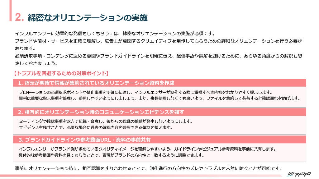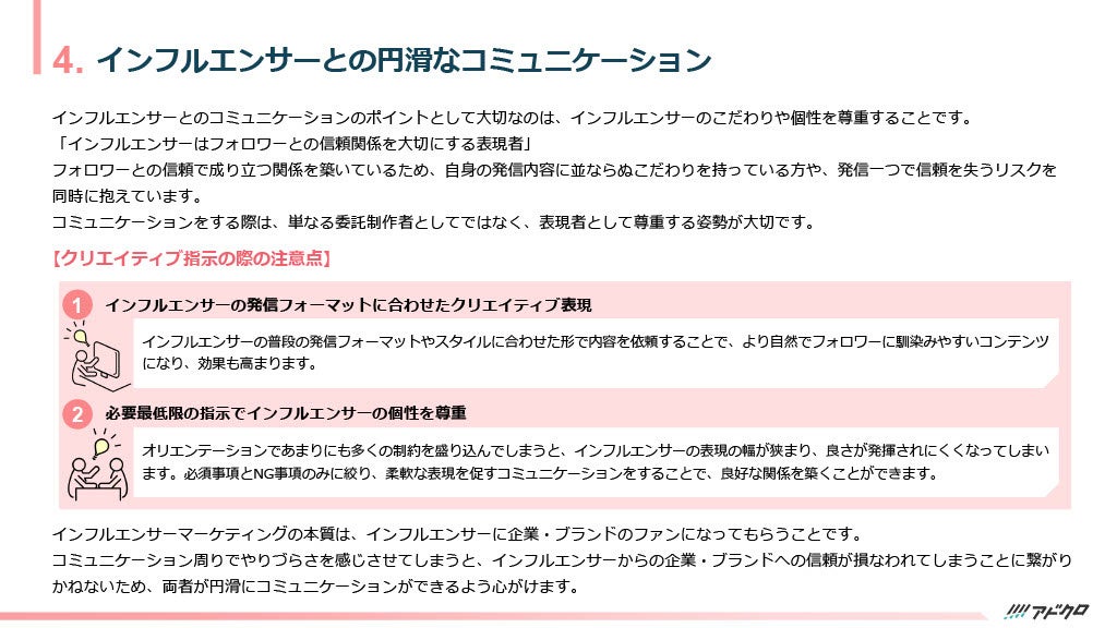 本資料では、インフルエンサー施策を成功に導く5つのポイントと、見落としがちな落とし穴をご紹介します。UUUMやByteDanceを経て独立、現在はインフルエンサー領域でビジネスを展開するプロフェッショナルが、インフルエンサー施策の立案から実施における注意点を解説していきます。全19Pの資料内で紹介している5つのポイントは以下の通りです。
