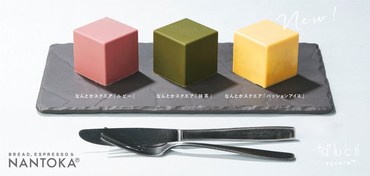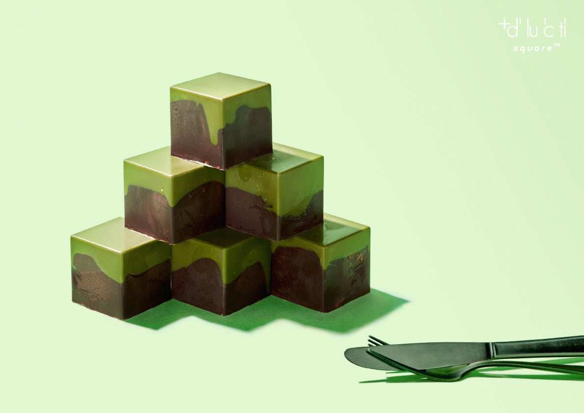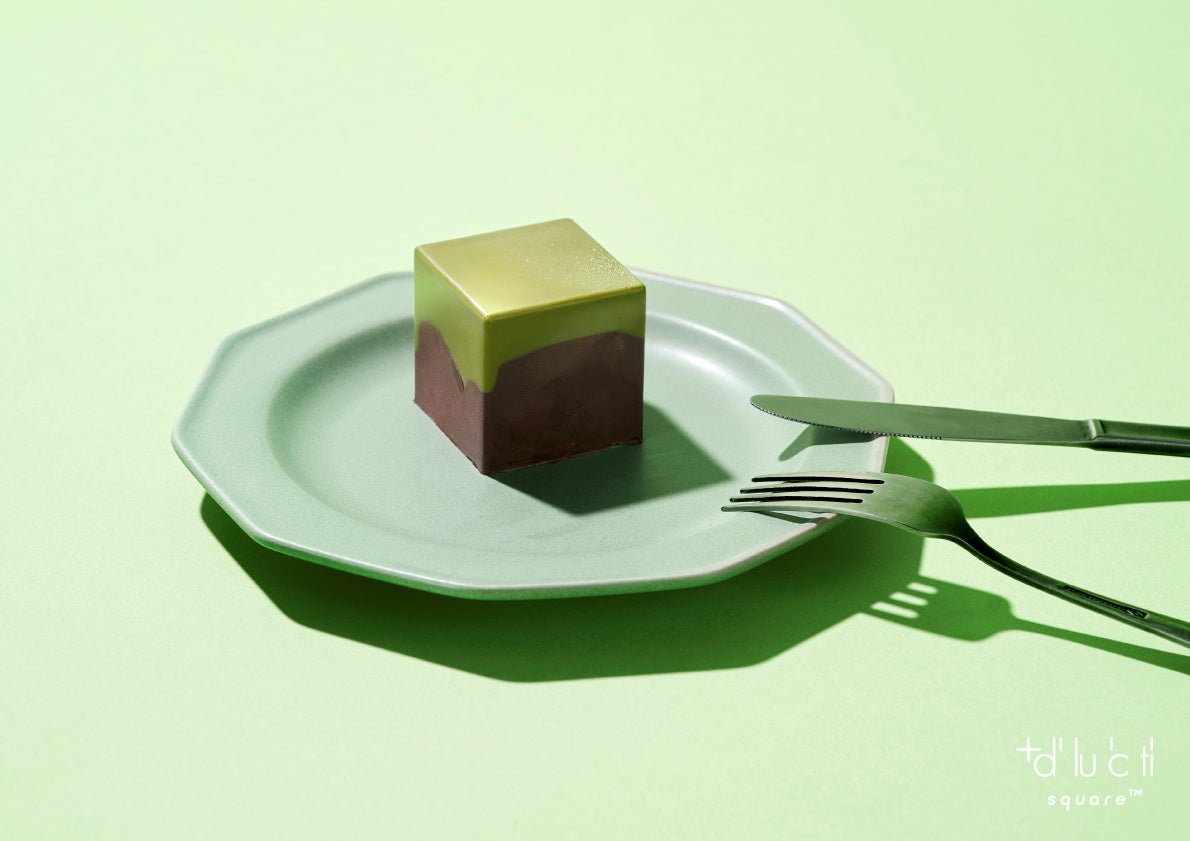 その名もなんとかスクエア〜抹茶ブロック〜。大人気の「抹茶」のムースの味はそのままにチョコの部分を抹茶とブラックの2種を使用した、見た目も楽しい渋谷系オトナスイーツです。