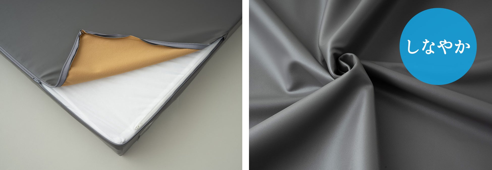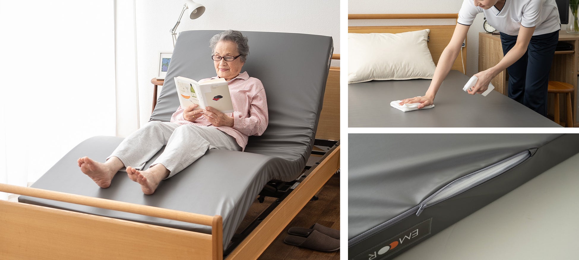 一般的な防水カバーに比べて、やわらかでしなやかな肌触り。通気性があるのに、撥水性が高いのでお手入れもしやすく、介護施設っぽくないカラーで、ご自宅でも使いやすいデザインです。