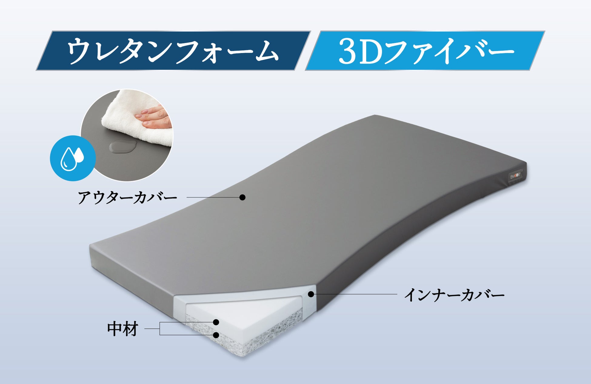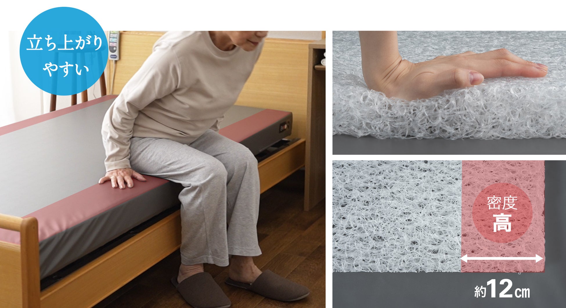 2層ハイブリット型マットレスは、ウレタンのみのマットレスよりも安定性が高く、さらに3Dファイバーの両サイドの密度を高くし、より硬めにすることで、端座位からの立ち上がりをサポートします。