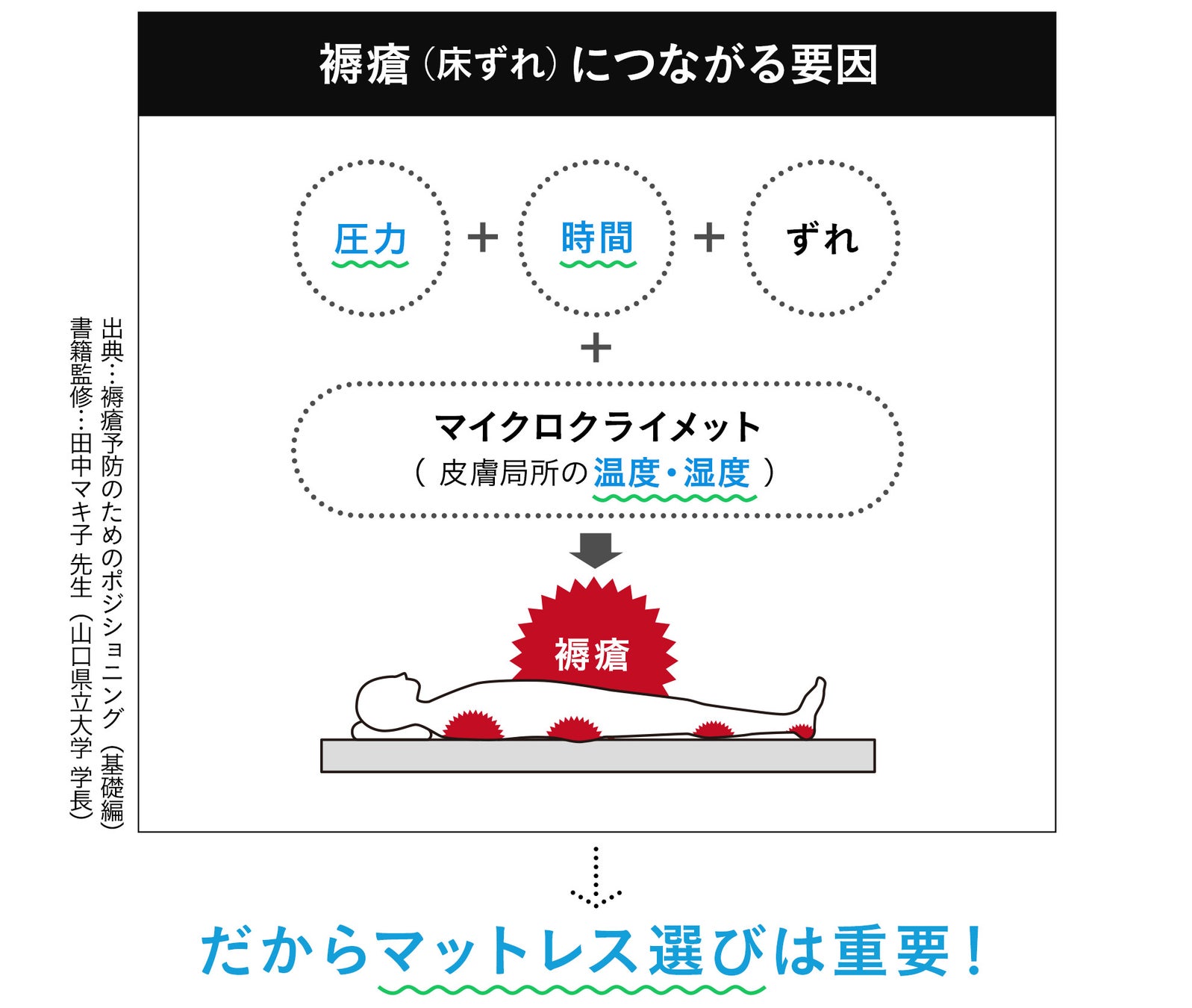 長く寝床にいることで起きる体への負担として、褥瘡(床ずれ)があります。原因としては、圧力・時間・皮膚局部の温度と湿度が大きく関係していることが分かっています。使用者に合うマットレス選びは欠かせないポイントなのです。