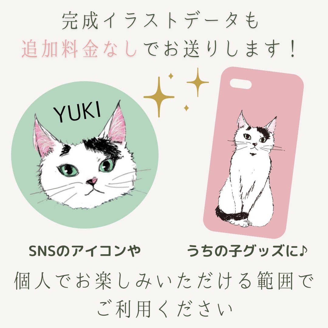 さらに、完成したイラストデータも追加料金なしでお届け!商用利用はできませんが、SNSのアイコンやうちの子グッズ制作など、ご自由にお使いいただけるのも本商品の大きな特徴です。
