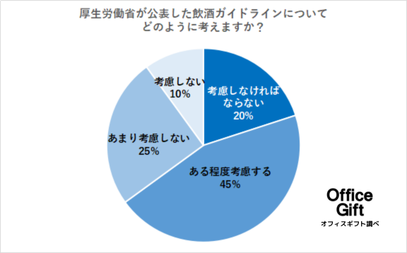 「厚生労働省が公表した飲酒ガイドラインについてどのように考えますか?」という質問をしたところ、「考慮しなければならない」「ある程度考慮する」と回答した方は全体の65%に及びました。
