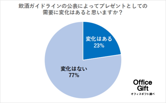 結果として、今のところ飲酒ガイドラインの公表によるプレゼント需要の変化はないという方が全体の77%を占めています。