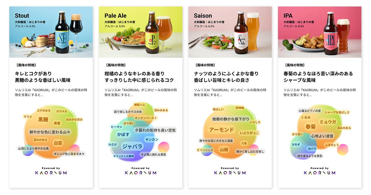 世界に数百種類あるビールのスタイル。大和醸造でも定番シリーズ『はじまりの音』の4 種をはじめ、さまざまなビールを醸造しています。それぞれのビールの風味・香りの伝え方には試行錯誤してきましたが、KAORIUM では、味の表現だけでなく食材や情景に例える多様な表現方法で、まさにクラフトビールの表現にはぴったりだと感じています。風味言語を見ながら味わうことで新たな風味の気づきなど、新たなビールの味わい方を楽しんで頂きたいです。