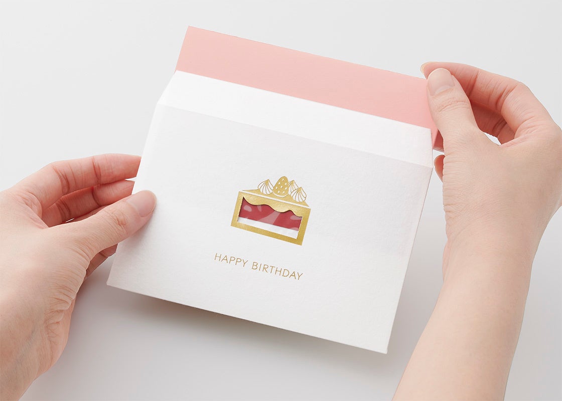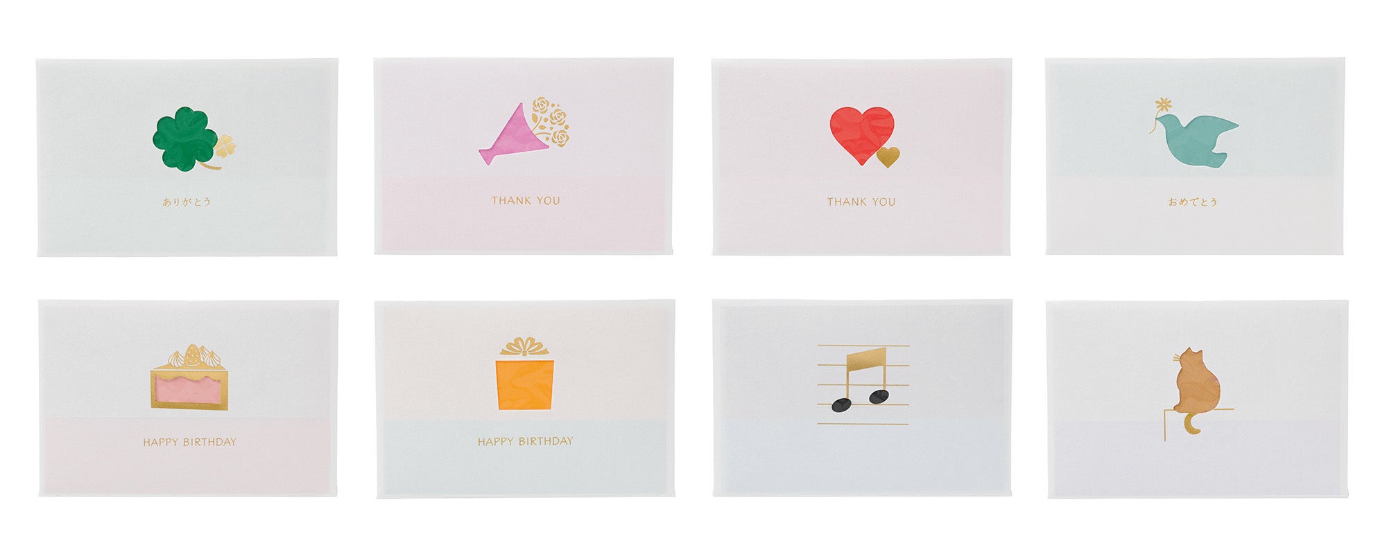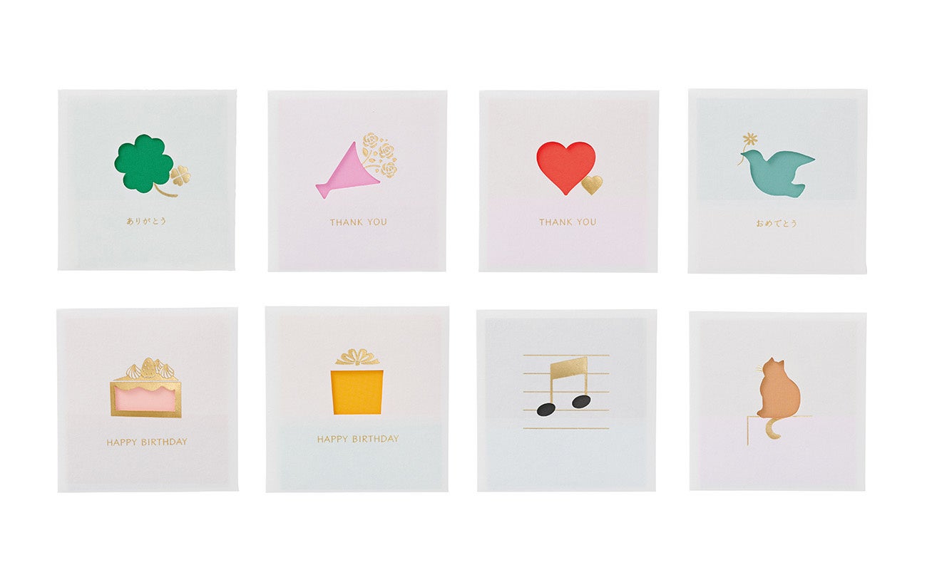 窓のかたちは、シリーズの中で人気が高い「クローバー」と「鳥」に加え、お祝いや感謝の気持ちを贈るのにぴったりな「花束」「ハート」「ケーキ」「ギフトボックス」、多目的に使える「音符」「ねこ」、の8種類です。贈り物に添えるのにちょうど良いミニサイズと、郵送できる定形郵便サイズの2サイズをご用意しています。