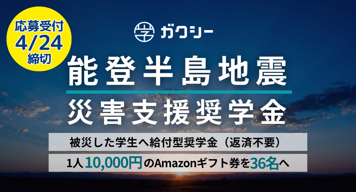 日本最大の奨学金プラットフォームを運営する株式会社ガクシー(本社:東京都港区、代表取締役:松原良輔、以下ガクシー)では、被災した学生やそのご家庭を支援するための奨学金『能登半島地震災害支援奨学金』を4月24日(水)まで、奨学金情報サイト「ガクシー」にて募集を受け付けます。
