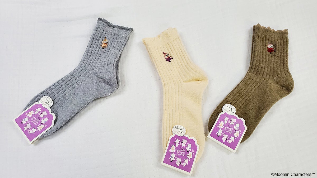 愉快そうに踊るリトルミイや姉のミムラねえさんがワンポイントになっているソックスやアームウォーマー。冬の寒さも忘れそうな楽しいアイテムです。