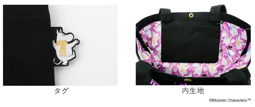 ーミンがひょっこり飛び出したようなタグや、総柄の内生地もポイントです。旅行のサブバックとしても便利な大き目サイズ。
