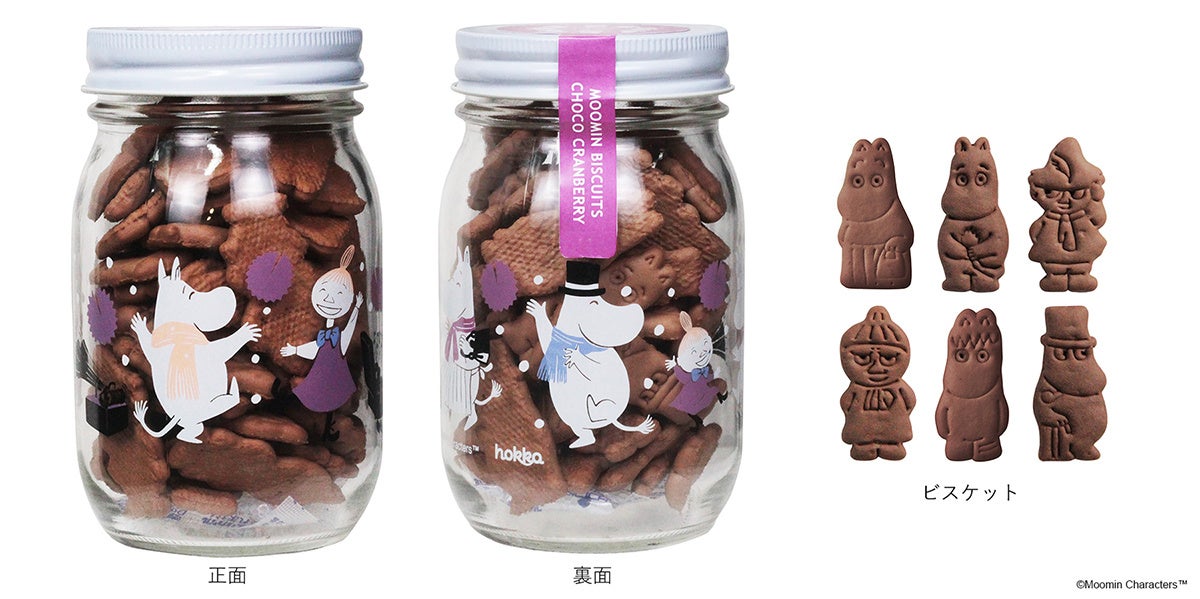 ムーミン谷の仲間たちの形をした、チョコクランベリー味のビスケット。冬のアートがあしらわれたボトル入りで飾っても楽しめます。