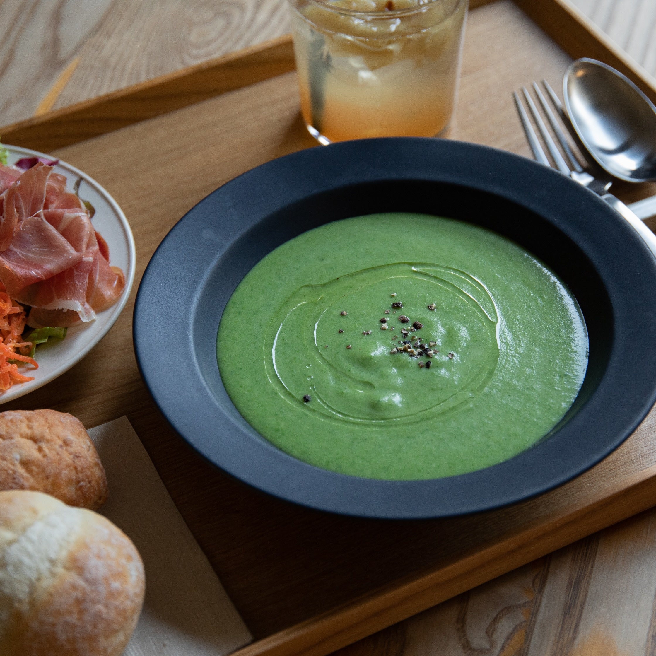 旬の菜の花のほろ苦さとじゃがいもの甘いクリーミーさを合わせた春らしい一品です。スープでありながらも、一口ひとくちがしっかりしているため、食べ終わった頃にはきっとお腹が満たされているはずです。ビーガンの人でも春を感じていただけるよう、生クリームではなく豆乳で仕上げました。