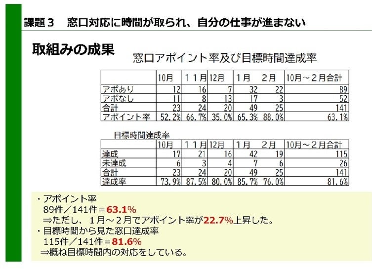 ・窓口対応は本来業務であるものの、予定外の来庁者対応により、計画的に業務が進まず、残業になっていたため、来庁者に対し事前アポイント制に今後協力いただくよう、口頭で丁寧に繰り返し依頼しました。その結果、事前のアポイント(約束)による訪問が3割も増えたことに加え、来庁目的が明確になることで適切な資料の事前準備が可能となり、窓口対応する職員の残業時間は取組前と比べて38%減少しました。