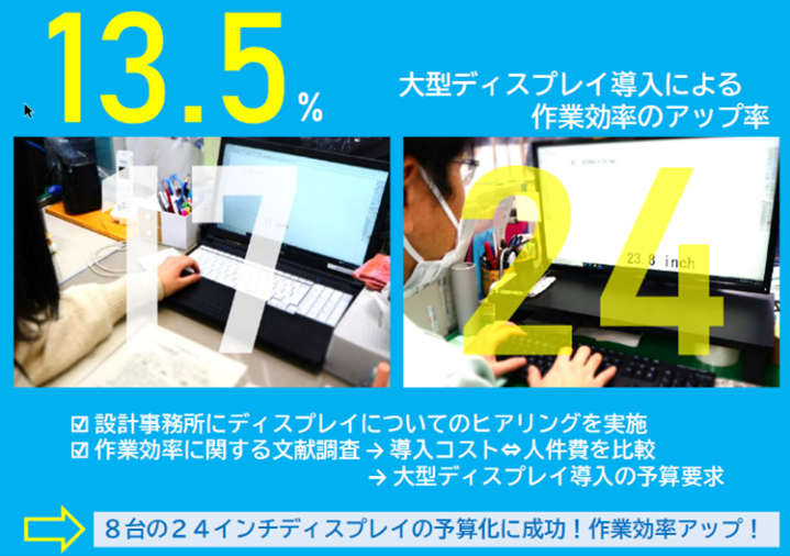 ・紙資料からデータへの移行が進んでおらず、業務効率が低下していることから、図面のCAD化・PDF化(データ化)に向け、資料の状況の確認やリストアップ等を進めました。また、業務効率化に向け、積算システムやモニターの導入の必要性を検証し、来年度の予算への追加を提案、実現につなげました。(導入後の平均作業時間が約37%削減される見込み)