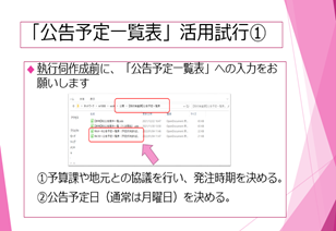 ・工事の発注時期が毎年6月~8月に集中することにより、過度な残業を引き起こしていたことが業務スケジュールの見える化をしたことで判明しました。そのため、2022年度以降は、「公告予定一覧表」を作成し、公表工事の平準化に向けて効果を検証し、会津若松市内の建設業界全体の課題につながる取組みの一歩となりました。