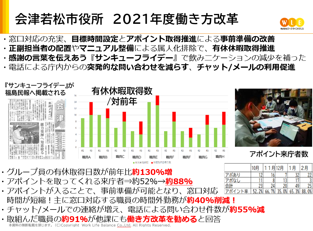 働き方改革コンサルティングの株式会社ワーク・ライフバランス(本社:東京都港区、代表取締役:小室淑恵)は、2021年7月より福島県会津若松市(市長:室井 照平)に長時間労働や仕事の属人化・偏りの改善などの働き方改革コンサルティングを導入し、8か月間にわたり働き方の見える化を実施したことで、モデル部署の庁内外の問い合わせ件数5割減、有休取得5割増といった成果をあげました。