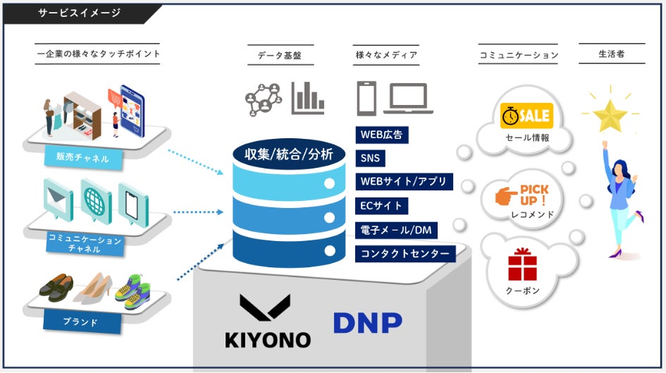 両社は、企業が保有する生活者(会員・顧客等)データを一元管理する「データ基盤」を軸に、デジタルマーケティングを総合的に支援するサービスを開始します。DM、チラシ、SP等のリアルマーケティングは勿論、デジタルマーケティングにも強みを持つDNPと、Web広告、CDP、MA、BI等のデジタルマーケティングソリューションやデータ活用に強みを持つKIYONOだからこそ実現可能なリアルとデジタル両軸のマーケティング支援によって、企業のマーケティング活動の効率化と成果の拡大につなげていきます。