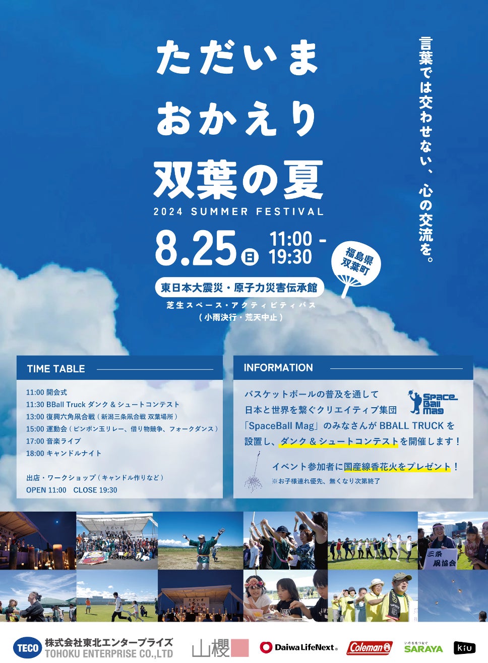 今年はバスケットの普及を通じてさまざまなコミュニティづくりやイベント企画を行うクリエイティブ集団・「SpaceBall Mag」とともに、特設バスケットコートを展開し、「BBall Truck ダンク&シュートコンテスト」を開催!新潟三条凧(いか)協会による復興六角凧合戦や、夏ならではの運動会、夕方からはライブとキャンドルナイトも行います! 様々なアクティビティを通して双葉の皆さんと、心の交流を深めたいと思います。