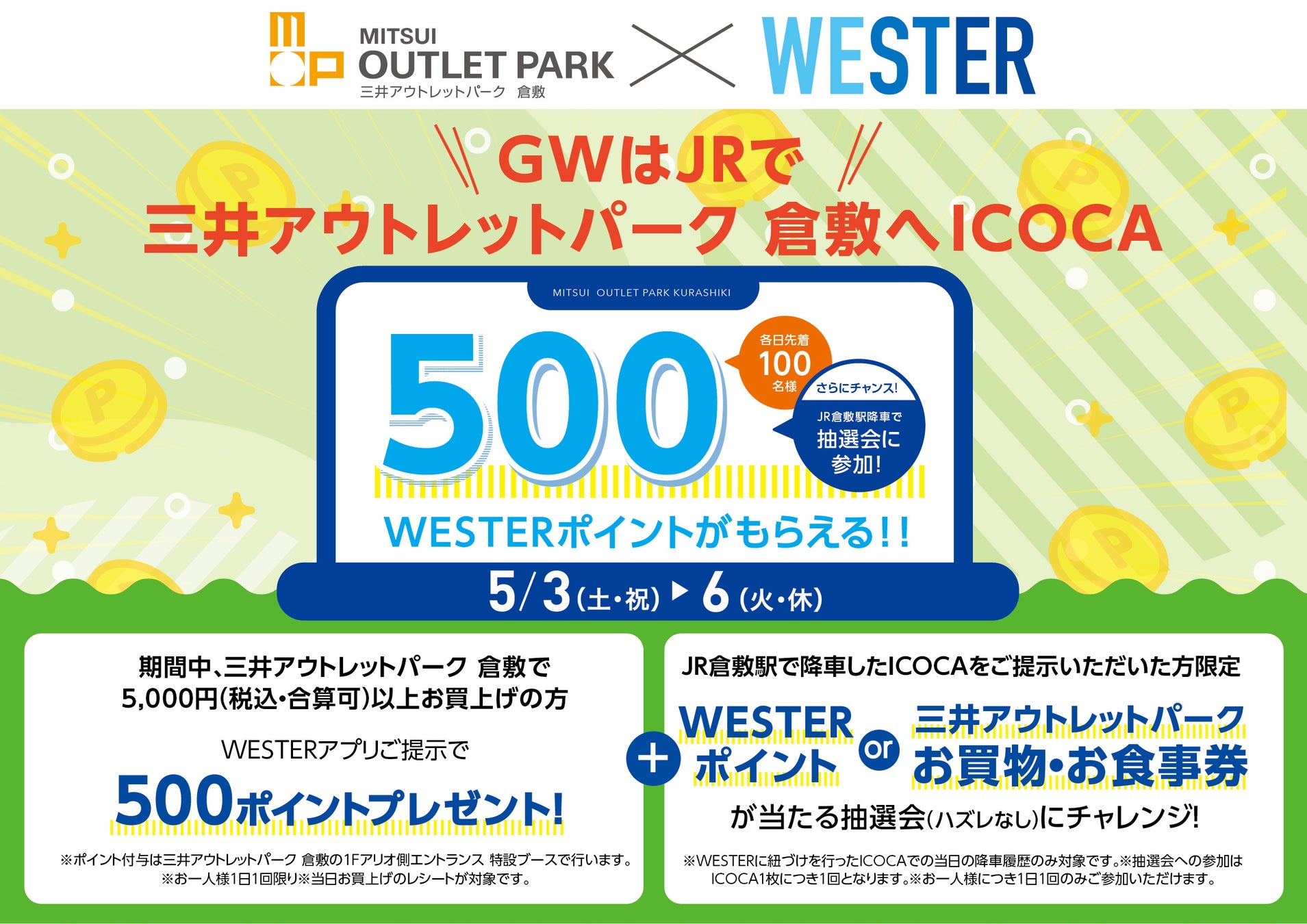 当日、三井アウトレットパーク 倉敷にて5,000円(税込・合算可)以上お買い上げ、かつWESTERアプリをご提示いただいた方にWESTERポイント500ポイントをプレゼントいたします。