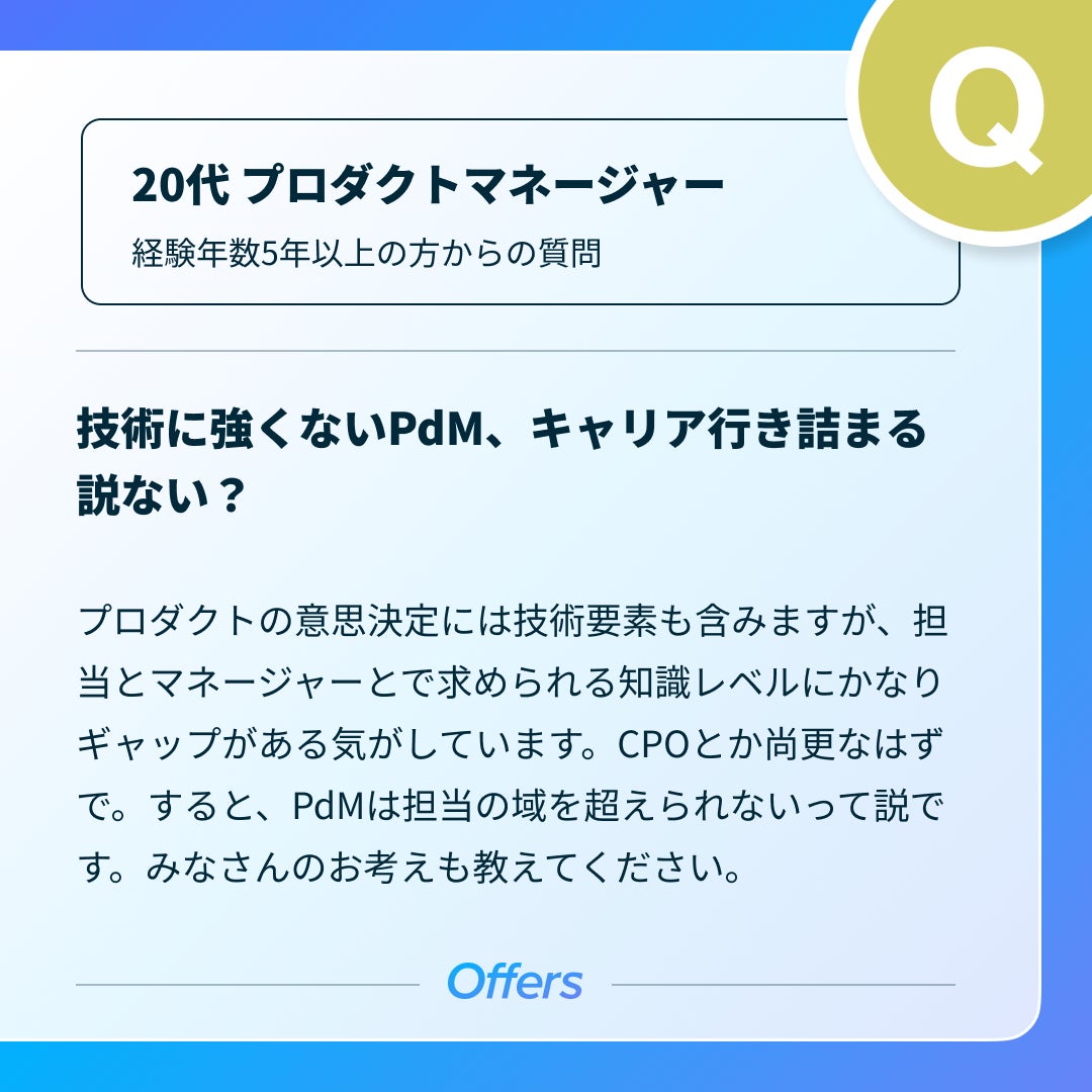 - プロダクトの意思決定には技術要素も含みますが、担当とマネージャーとで求められる知識レベルにかなりギャップがある気がしています。CPOとか尚更なはずで。すると、PdMは担当の域を超えられないって説です。みなさんのお考えも教えてください。