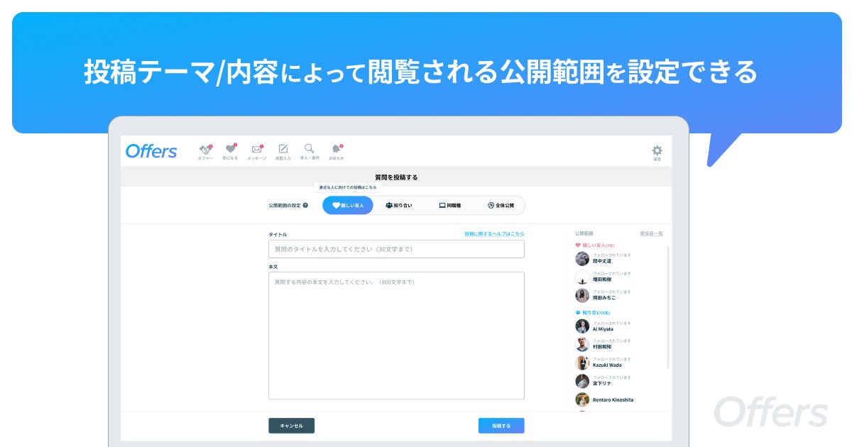 - 各ユーザーさまの発信力をはじめ、質問者の問題提起、回答者の経験/アドバイスなどを知ることで、オファー送信材料として参考にすることができる