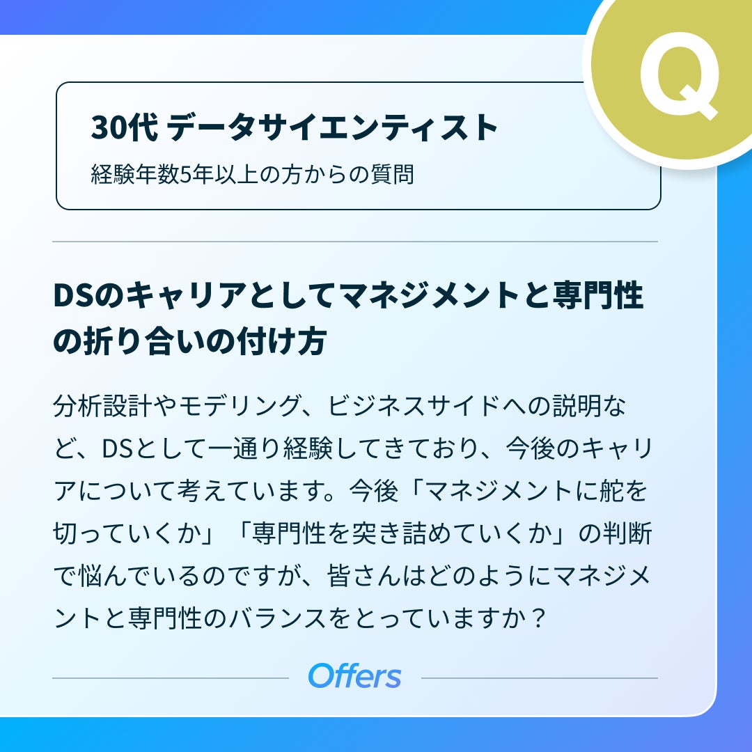 - 分析設計やモデリング、ビジネスサイドへの説明など、DSとして一通り経験してきており、今後のキャリアについて考えています。今後「マネジメントに舵を切っていくか」「専門性を突き詰めていくか」の判断で悩んでいるのですが、皆さんはどのようにマネジメントと専門性のバランスをとっていますか?