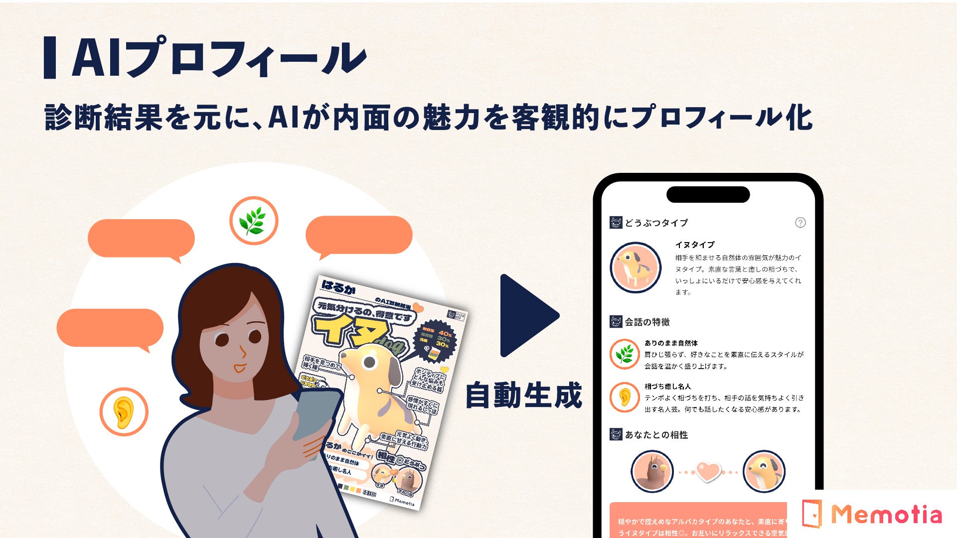 内面だけのマッチングアプリ「Memotia」が世界初の会話内容を基に恋愛傾向をAIが診断し、プロフィールを自動生成する新機能をリリース